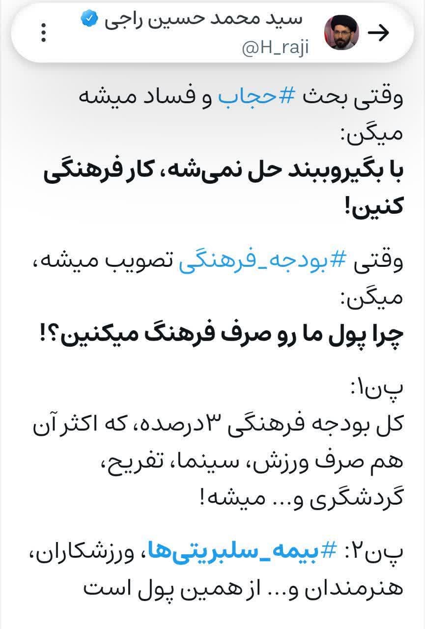هم حمله به بودجه نهادهای فرهنگی، اقدامی سطحی و عوامانه است و هم تخصیص بی حساب و کتاب بودجه به این نهادها غلط است؛ در اینجا باید معیار وجود داشته باشد. اساساً فرهنگ، زیربنای سایر عرصههاست؛ اصل، فرهنگ است و مقولاتی نظیر سیاست، اقتصاد و ... هم در ذیل فرهنگ تعریف میشوند.