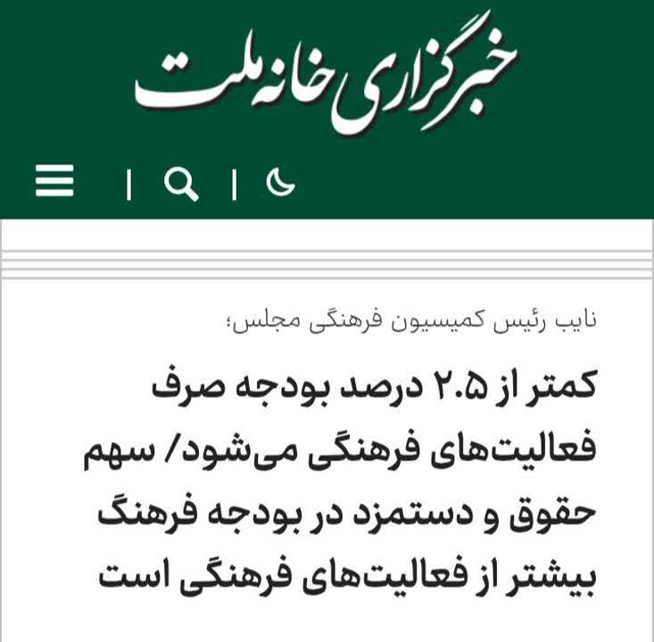 وی با تأکید بر اینکه بخش اعظم بودجه فرهنگی برای هزینههای اجتناب ناپذیر مانند حقوق و دستمزد کارمندان در وزارت فرهنگ و ارشاد اسلامی، وزارت میراث فرهنگی، گردشگری و صنایعدستی، وزارت ورزش و جوانان و سازمان صداوسیما و دستگاههای فرهنگی دیگر است، تصریح کرده است: «بنابراین، وقتی می گوییم ۲.۵ درصد بودجه کشور برای حوزه فرهنگ است، اینطور نیست که از کل بودجه کشور ۲.۵ درصد را جدا میکنند تا صرف فعالیتهای فرهنگی شود؛ بلکه بودجه فعالیتهای فرهنگی بخش ضعیفتری از این درصد است و عمده بودجه در قالب بند (و) و پرداختهای اجتنابناپذیر حقوق و دستمزد است».