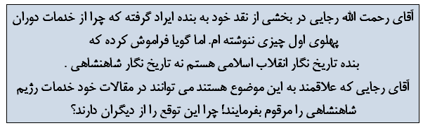 آقای رحمت الله رجایی در بخشی از نقد خود به بنده ایراد گرفته که چرا از خدمات دوران پهلوی اول چیزی ننوشته ام. اما گویا فراموش کرده که بنده تاریخ نگار انقلاب اسلامی هستم نه تاریخ نگار شاهنشاهی . آقای رجایی که علاقمند به این موضوع هستند می توانند در مقالات خود خدمات رژیم شاهنشاهی را مرقوم بفرمایند! چرا این توقع را از دیگران دارند؟
