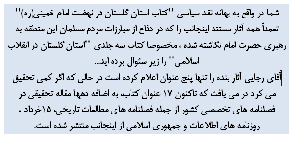باسلام، لطفا پاسخ زیر را به عنوان جوابیه اینجانب به ده صفحه مطالبی که در نقد سیاسی آثار بنده- مخصوصا کتاب "استان گلستان در نهضت امام خمینی(ره)" - چاپ کرده اید، برابر قانون مطبوعات و اخلاق حرفه ای در آن فصلنامه منتشر فرمایید. در صورتی که به آزادی بیان و بی طرفی در قبال مخالفان سیاسی خود معتقد هستید این جوابیه را بدون کم و کاست و بدون حاشیه نویسی در اولین شماره منتشر نمایید.