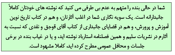شما در حالی بنده را متهم به عدم بی طرفی می کنید که نوشته های خودتان کاملاً جانبدارانه است. یک سویه نگاری شما در اغلب آثارتان، و هم در کتاب تاریخ نوین آموزش و پرورش، و هم در قضایای جانبداری از کتاب آقای قوجق و نقدی که نسبت به آثارم در نشریات سلیم و همین فصلنامه استارباد نوشته اید، و یا در غیاب بنده در برخی جلسات و محافل عمومی مطرح کرده اید، کاملا مشهود است.
