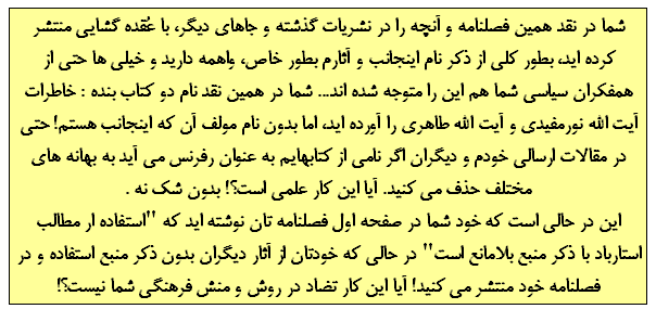 باز شما در همین نقد نام دو کتاب بنده : خاطرات آیت الله نورمفیدی و آیت الله طاهری را آورده اید، اما بدون نام مولف آن که اینجانب هستم! حتی در مقالات ارسالی خودم و دیگران اگر نامی از کتابهایم به عنوان رفرنس می آید به بهانه های مختلف حذف می کنید. آیا این کار علمی است؟! بدون شک نه . حتی در مقاله ای که برای شماره همین فصلنامه استارباد بنام "تیمسار مُزین در قامت یک زمین خوار درباری" بنده بنا به تقاضای آقای بایزیدی مدیر مسئول فصلنامه فرستادم منابع آن را حذف نمودید و در پایان نوشته اید: "منابع مقاله نزد نگارنده موجود می باشد." در حالی که من اصلا چنین جمله ای ننوشته ام و شما به میل خود و بدون اجازه به مقاله ام اضافه کرده اید. چون این نحو مقاله نویسی بدون منبع را بنده علمی و حرفه ای نمی دانم.