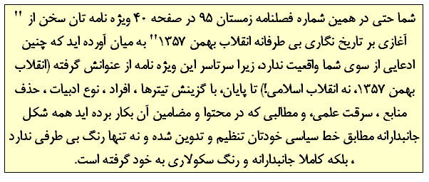 شما حتی در همین شماره فصلنامه زمستان 95 در صفحه 40 ویژه نامه تان سخن از "آغازی بر تاریخ نگاری بی طرفانه انقلاب بهمن 1357" به میان آورده اید که چنین ادعایی از سوی شما واقعیت ندارد، زیرا سرتاسر این ویژه نامه از عنوانش گرفته (انقلاب بهمن 1357، نه انقلاب اسلامی!) تا پایان، با گزینش تیترها ، افراد ، نوع ادبیات ، حذف منابع، سرقت علمی، و مطالبی که در محتوا و مضامین آن بکار برده اید همه شکل جانبدارانه مطابق خط سیاسی خودتان تنظیم و تدوین شده و نه تنها رنگ بی طرفی ندارد ، بلکه کاملا جانبدارانه و رنگ سکولاری به خود گرفته است.