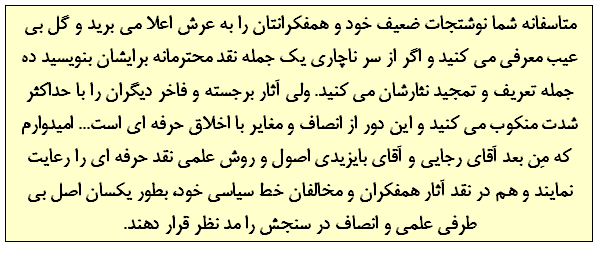 کلام آخر اینکه اشکالات دیگری نیز در این ده صفحه نقادی غیر علمی شما هست که پاسخ آنها موجب اطاله کلام می شود، وگرنه هیچ نکته ای را بی پاسخ نمی گذاشتم . فعلا به همین مقدار بسنده می کنم تا بعد . از طرف دیگر امیدوارم که مِن بعد آقای رجایی و آقای بایزیدی اصول و روش علمی نقد حرفه ای را رعایت نمایند و هم در نقد آثار همفکران و مخالفان خط سیاسی خود، بطور یکسان اصل بی طرفی علمی و انصاف در سنجش را مد نظر قرار دهند.